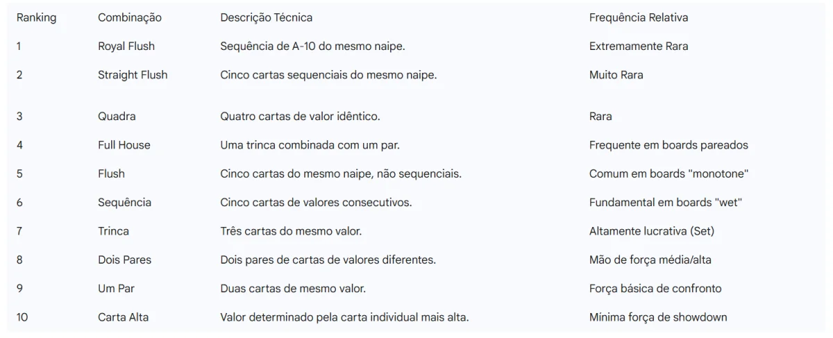 - Mãos de Lixo: Combinações desconectadas e de naipes diferentes (ex: 72o, J4o). Devem ser descartadas imediatamente para evitar situações de dominância e perdas desnecessárias.