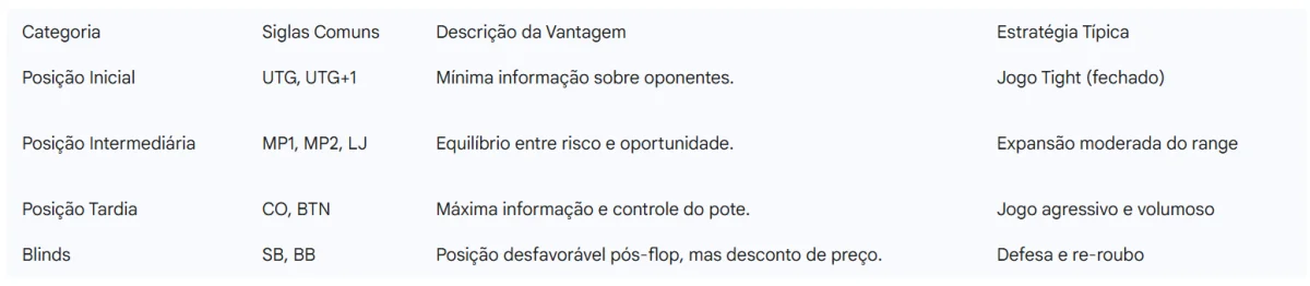 O Botão (BTN) é a posição mais lucrativa do jogo, pois permite observar as ações de todos os adversários em todas as rodadas pós-flop. Inversamente, o Under the Gun (UTG) exige uma seleção extremamente rigorosa, pois o jogador terá que enfrentar a ação de toda a mesa sem saber como os adversários reagirão às suas apostas.