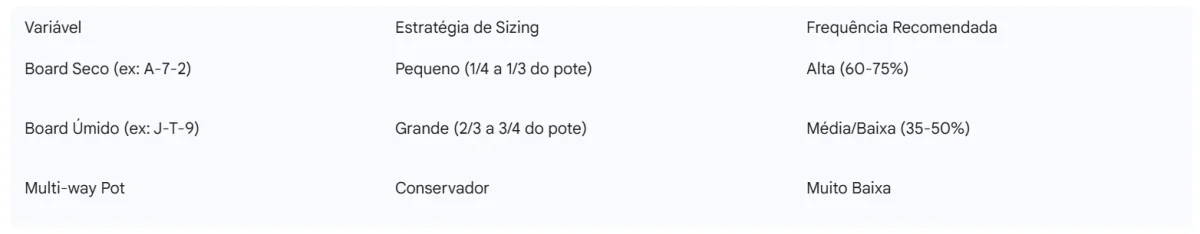 C-betar em boards secos com cartas altas favorece o agressor original, cujo range contém mais pares altos e ases. Já boards coordenados favorecem o range de quem apenas defendeu o blind, exigindo apostas maiores para proteção ou simplesmente o check para evitar check-raises agressivos.