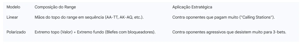 Utilizar um range polarizado permite que mãos de força média (como 88 ou ATs) sejam mantidas no range de "call", realizando sua equidade de forma mais barata, enquanto as mãos de blefe (como A5s ou K9s) colocam pressão máxima e possuem "bloqueadores" contra as mãos mais fortes do oponente.