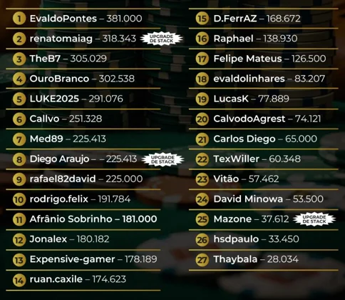 O ranking de fichas mostra um cenário bastante equilibrado no topo, com destaque para EvaldoPontes, que lidera o chip count com 381.000 fichas. Logo atrás, nomes conhecidos do field seguem pressionando: